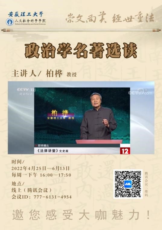 柏桦教授走下央视讲坛,走上安理讲台,投入到为我校本科生的授课工作中。从4月25日到6月13日,每周一下午16:00-17:50,柏桦教授通过腾讯会议为政治学与行政学专业学生讲授《政治学名著选读》,讲授过程中,柏桦教授引经据典,风趣幽默,观点鲜明、思想深邃、眼光独到、妙趣横生。该课程同时向全校师生开放。