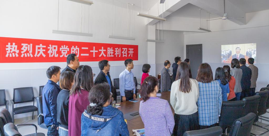 在崇智楼B203会议室,外国语学院20余名党员干部集中收听收看党的二十大开幕会直播,认真聆听习近平总书记代表第十九届中央委员会向大会所作的报告。听取习近平总书记的报告后,大家精神抖擞,一致表示,要认真学习宣传贯彻党的二十大精神,高举中国特色社会主义伟大旗帜,全面贯彻习近平新时代中国特色社会主义思想,弘扬伟大建党精神,自强自信、守正创新,踔厉奋发、勇毅前行,为全面建设社会主义现代化国家、全面推进中华民族伟大复兴而团结奋斗!