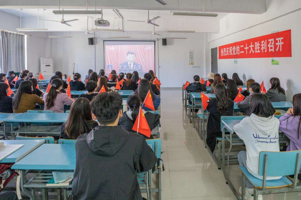 在崇智楼B233教室,学院各年级50余名学生党员、入党积极分子代表、学生会主席团成员集中收听收看党的二十大开幕会。