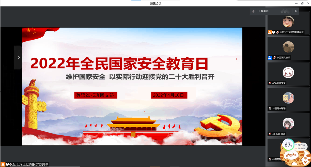 4月10日-16日,外国语学院年级辅导员、各团支部积极举办了国家安全教育日微团课。班会上,各团支部书记领学了以习近平同志为核心的党中央关于总体国家安全观、国家安全工作的重大部署和要求。同学们通过在线互动答疑掌握了什么是国家安全、国家安全包括哪些方面,简单了解《国家安全法》等国家安全法律,并探讨作为当代大学生,如何践行总体国家安全观,自觉履行维护国家安全的义务。