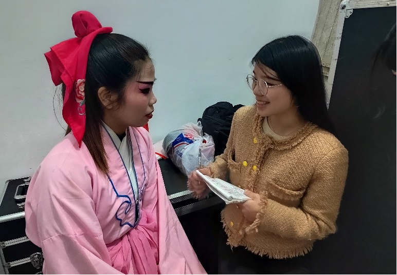 1月27日,实践队来到临川区连城乡,欣赏在临川区支持下采茶戏民间剧团——华娟青年采茶戏剧团的戏曲表演。晚上7点,戏曲即将上演,提前半小时,台下已经坐满了人。台上敲锣打鼓,清音袅袅,水袖飞舞,戏韵悠然,“一往而深”。通过青年戏曲传承人周娟,实践队员了解到戏剧团在临川区28个乡镇每年安排120场演出,每场2200元,这大大提升了戏曲传承人的收入水平,辐射带动服装、道具等行业的发展。