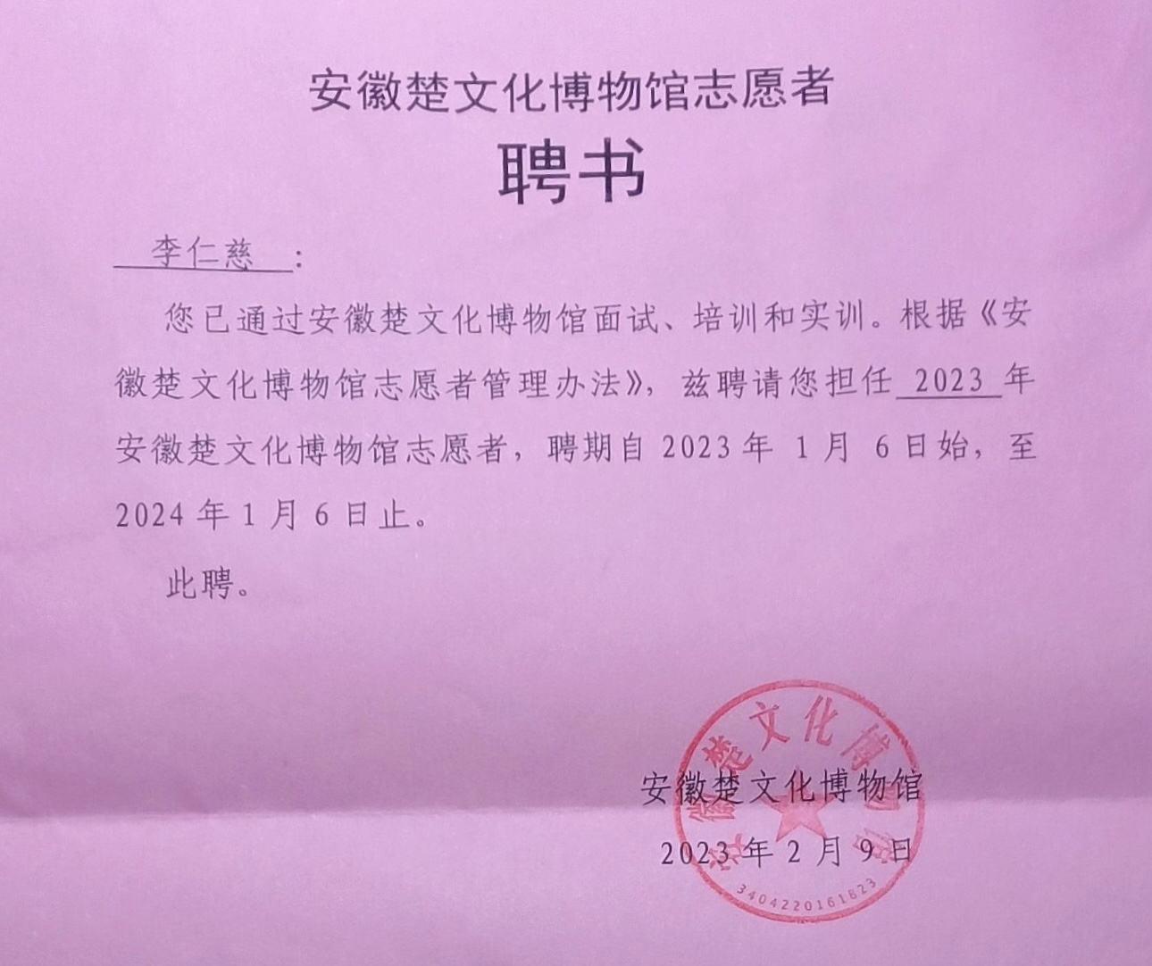 博物馆为李仁慈颁发聘书