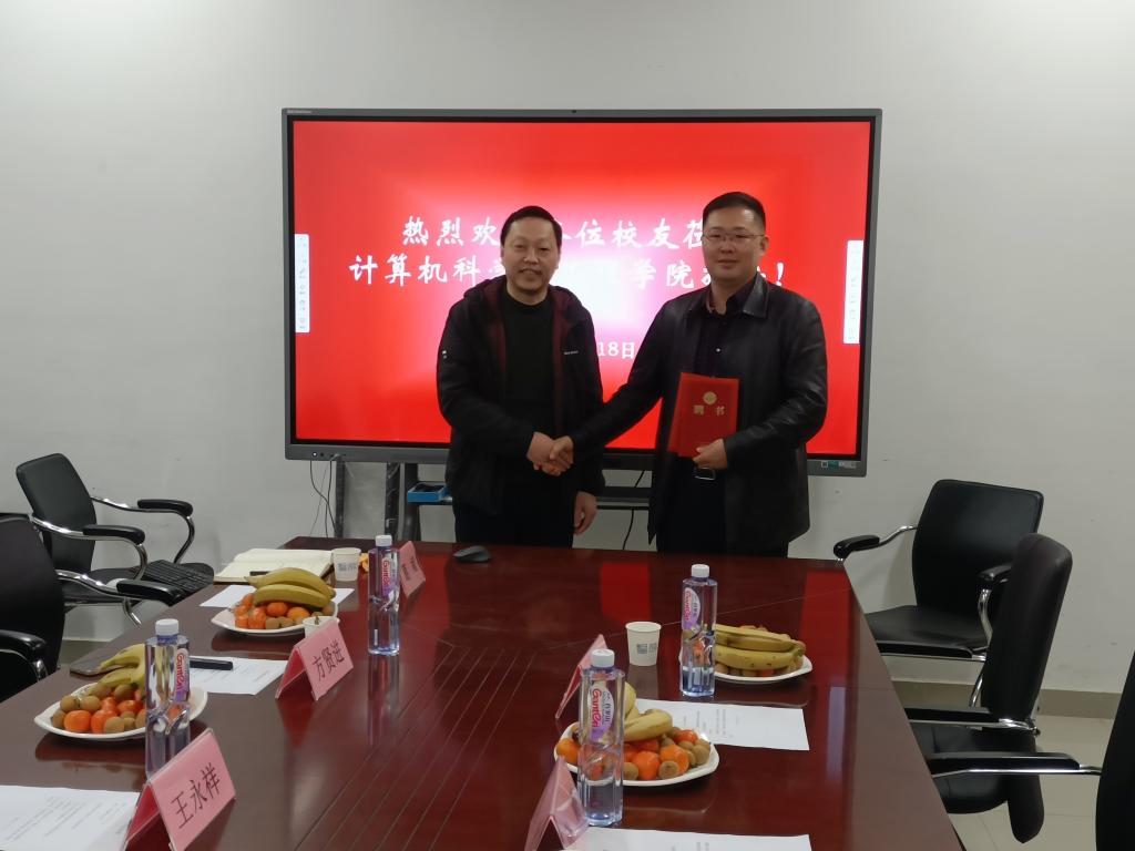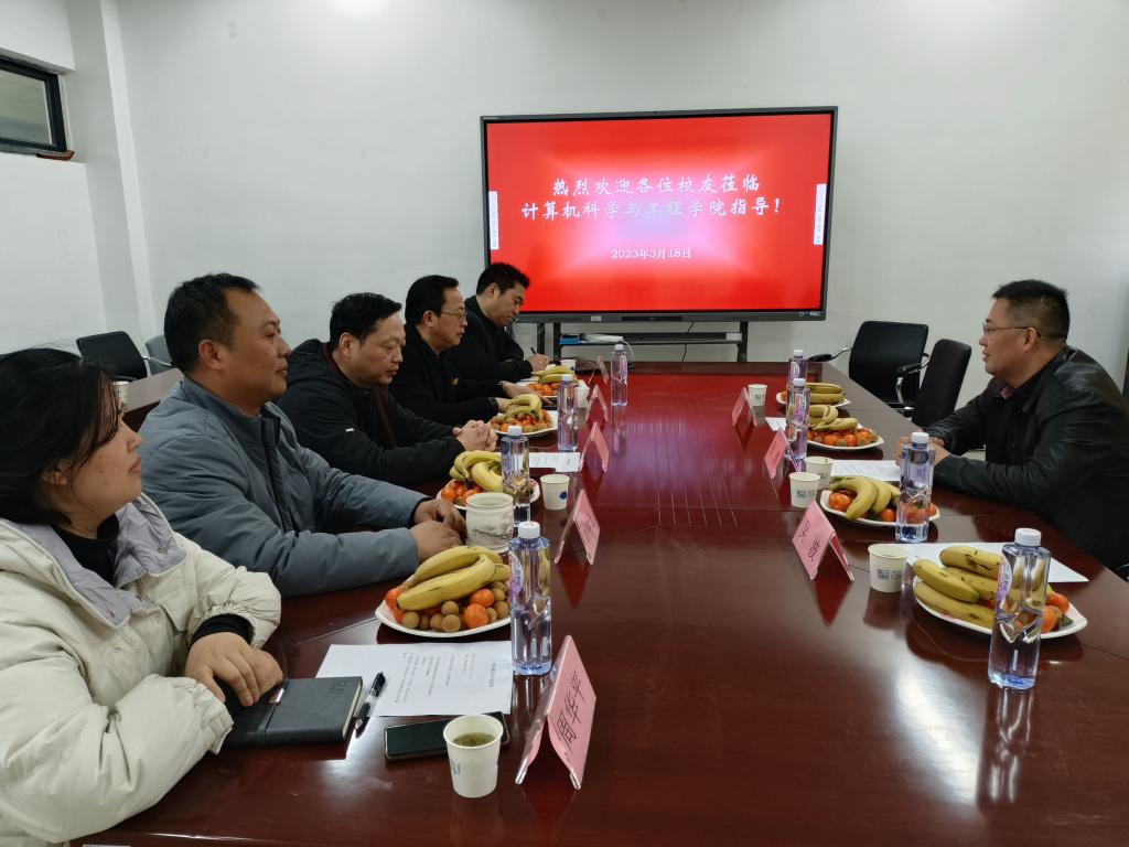 3月18日下午,计算机科学与工程学院2006届校友宁夏天地奔牛实业集团有限公司副总经理张鹏、淮南电视台台长2002届校友吴波等2人荣归母院。