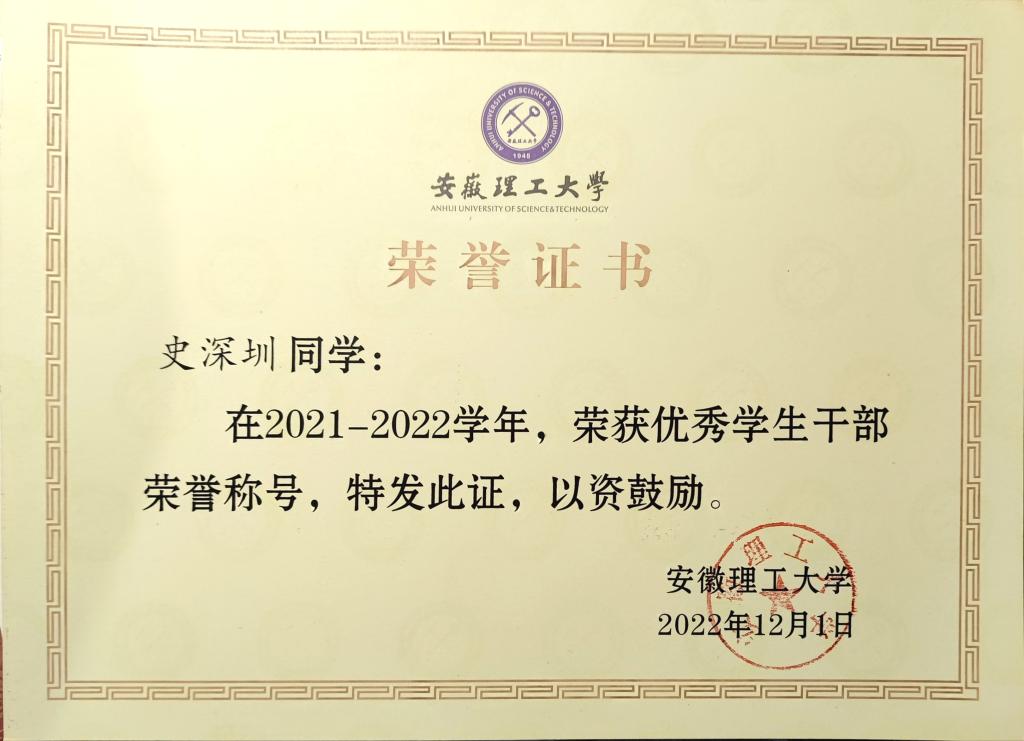 史深圳,光电信息19-1班长,中共党员,励志奖学金获得者,三好学生,优秀学生干部,考研录取深圳大学光学工程专业。