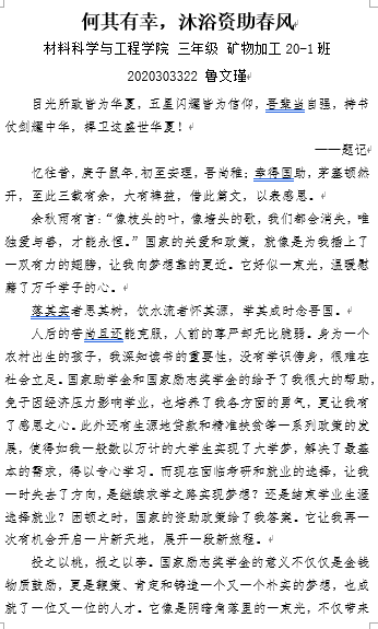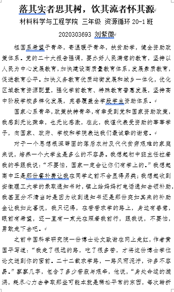 为强化受资助同学的责任担当,营造勤奋学习、自立自强的氛围,学院开展了资助诚信教育主题征文活动。受资助同学积极投稿,累计收到作品47篇。作品中同学们书写了自身刻苦学习、努力拼搏的经历,同时抒发了感恩社会,想为国家、学校和他人贡献出自己一份力量的家国情怀。通过资助征文进一步强化了受资助同学们的诚信意识,并彰显出当代大学生的青春风采。