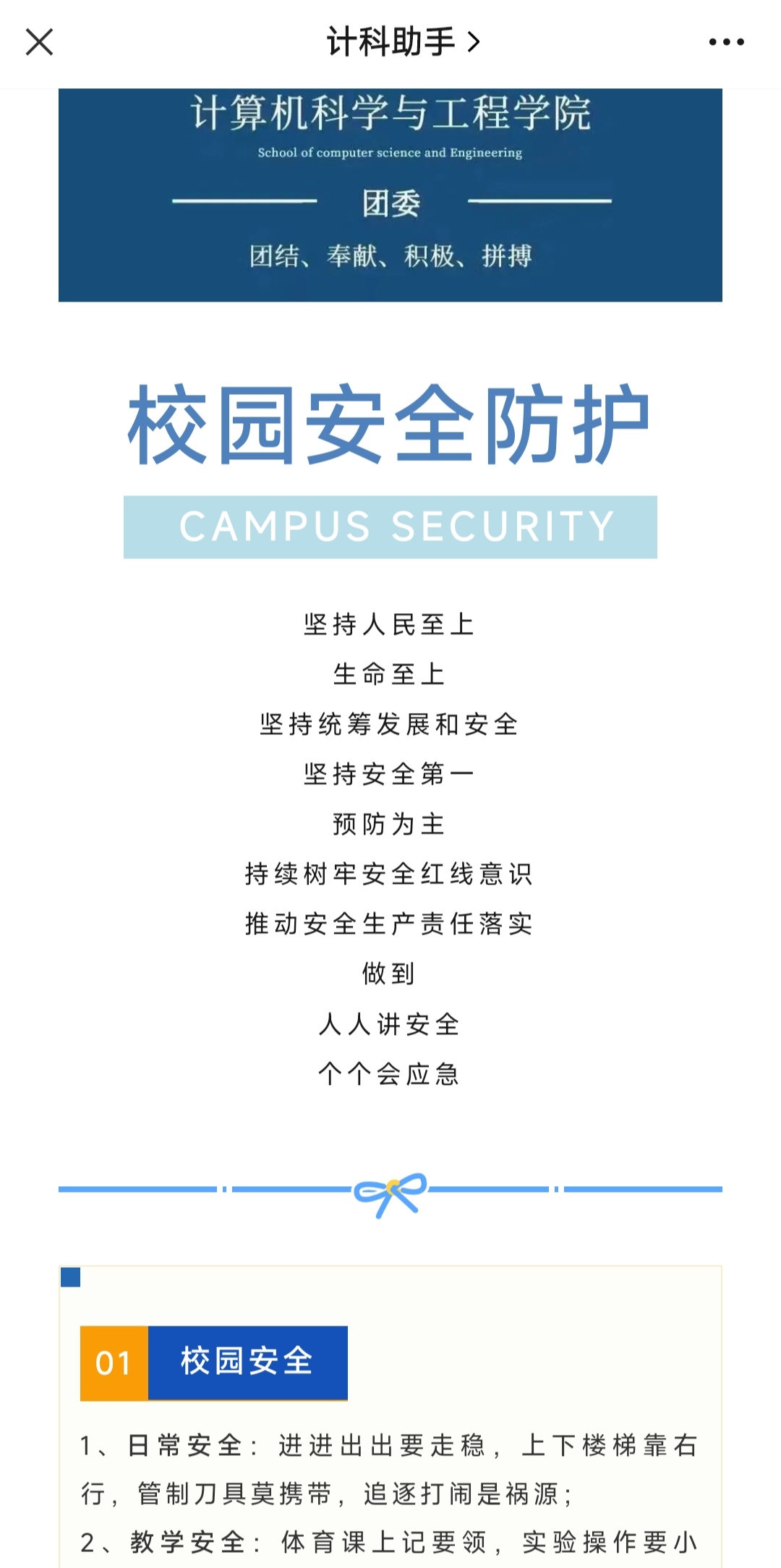 6月13日,学院通过计科助手、易班等网络媒体平台,从校园安全、网络安全、食品安全、消防安全、人身财产安全、实验室安全、心理安全等多方面普及安全知识,通过案例分析、学习安全标识,提高自我预防能力和安全意识,营造全体参与的良好氛围,使安全第一的意识深入人心。