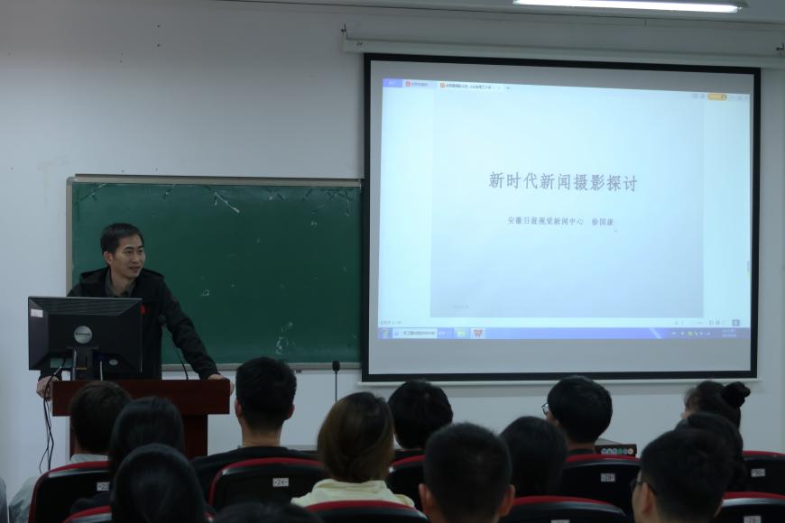 邀请安徽省摄影家协会副主席、安徽日报视觉新闻中心副主任,高级记者、一级摄影师徐国康到崇智楼329报告厅作《新时代新闻摄影探讨》报告。徐国康通过大量的摄影作品进行比较,从“虚实对比、大小对比、明暗对比、冷暖对、动静对比、方向对比”等方面论证了“新闻摄影要主题鲜明、主体突出”;重点阐述了“如何做到构图新颖画面生动”。徐国康在报告中结合了自己工作多年的获奖作品,应用大量的成功案例进行讲解,把理论与实践相结合,既有理论高度,又有实践指导,为广大师生带来了一场精彩的学术盛宴。