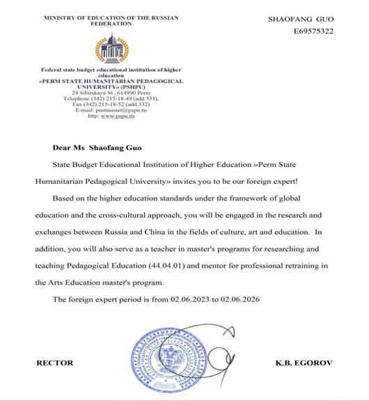 近日,我校人文社会科学学院郭少芳老师正式受聘为俄罗斯联邦教育部国家预算高等教育机构彼尔姆国立人文师范大学外国专家,担任专业艺术教育再培训硕士项目的研究生导师。