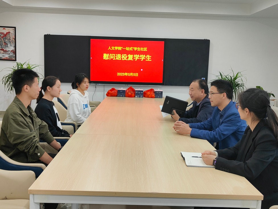 5月5日下午,人文社会科学学院依托“一站式”学生社区平台举办了慰问退役复学大学生活动,学院党委书记王大贤、院长方胜、党委副书记周雪晴向退役复学学生致以亲切的问候和祝愿,并为学生发放慰问品。