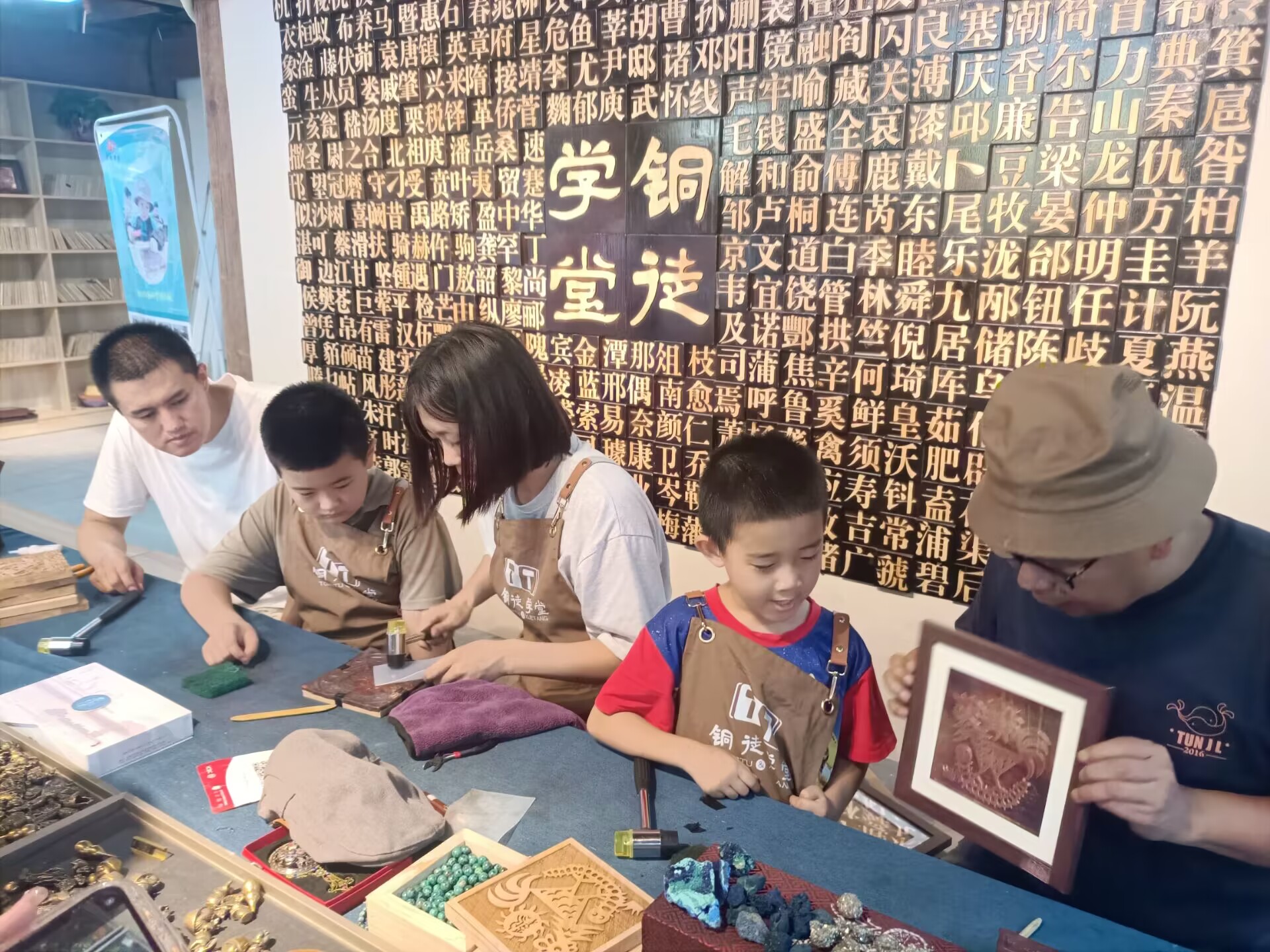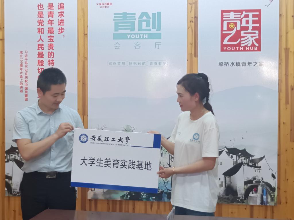 感受特色文化,躬行美育实践。在义安区工作人员的带领下,实践团一行走进了犁桥水镇,近距离感受了徽派建筑和铜陵特有的文化。实践团成员自行观察了铜版画的制作、糖人的制作以及米雕的制作,对于我国传统工艺有了更进一步的了解,也坚定了实践团成员的文化自信。在犁桥水镇,实践团带队老师和共青团义安区委员会书记共同进行了“安徽理工大学大学生美育实践基地”揭牌仪式。