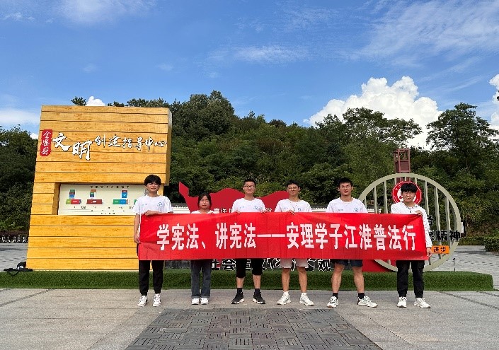 深挖红绿资源,盘活特色产业。当前的金寨已经成功创建为国家全域旅游示范区,在金寨县新时代文明实践中心,团队了解了金寨县依托青山绿水、深挖红色资源,延长旅游产业链,促进产融合发展、推进乡村振兴的先进经验和突出成就。仅今年五一期间金寨共接待游客52.5万人次,实现旅游收入1.52亿元。据相关数据显示,金寨县茶叶经营综合产值已达35亿元、中药材经营综合产值51.3亿元,共惠及人口40余万。随后团队成员在文明实践中心进行普法宣传,号召学宪法、守宪法,以实际行动助力乡村振兴。