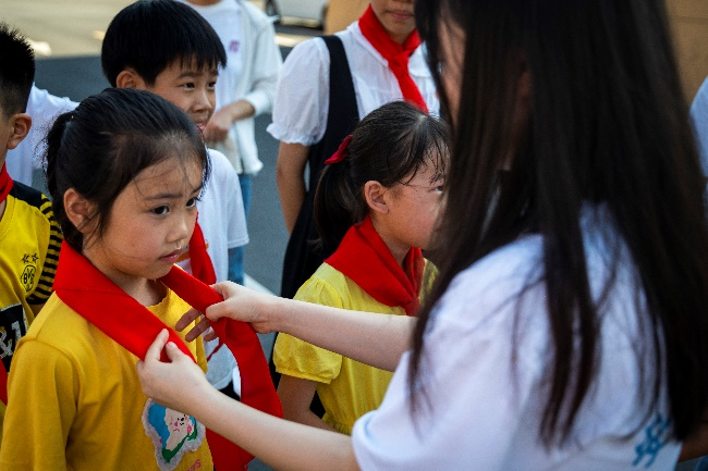 红色研学映初心,童心向党担使命。红色是中国共产党、中华人民共和国最鲜亮的底色。红色传统教育要从娃娃抓起,为让红色基因深深根植于青少年的心灵,引导其树立正确的世界观、人生观、价值观,实践团针对留守儿童开展了“红色教育”主题活动。站在校园外,实践团成员为留守儿童戴上红领巾,与少先队员们进行互动。步入课堂中,团队成员讲述党史故事和红军长征故事并提出期望,希望青少年儿童们珍惜来之不易的生活,永葆爱党爱国的热情。为推进“党团队”一体化建设,让红色教育在团队之间与党团之间,实现顺利衔接与过渡,团队成员带领留守儿童辨识党旗、团旗和队旗,并一起学习领悟每一面旗帜的深刻内涵。