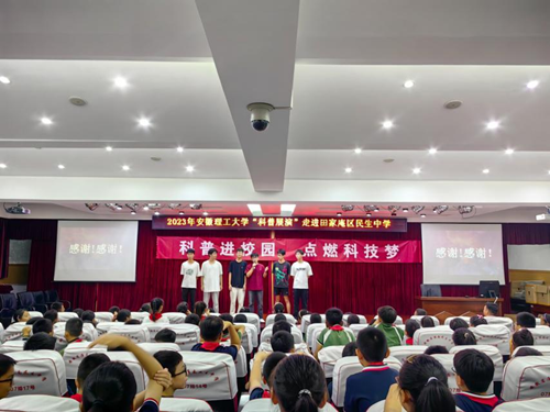 为深入贯彻落实习近平总书记关于“科技创新、科学普及是实现创新发展的两翼,要把科学普及放在与科技创新同等重要的位置”的重要指示精神,帮助中小学生认识科学、走进科学、热爱科学,9月21日,在电气与信息工程学院团委组织下,电子设计协会、化学与火药纹画社、航模与科技践行协会大学生们走进淮南市田家庵区民生中学联合开展大手拉小手科普展演活动。
