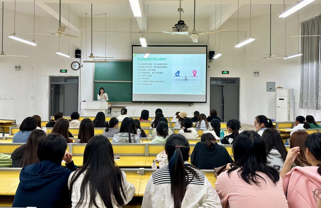 王冰洁以《体会差异,自信人生》为题,通过组图展示社会对男生和女生的刻板印象引入讲座,她从生理和社会两个层面分析了女性在个体与群体中的独特性和差异性,特点是智力结构、情感意志活动、人际交往和情感动机等方面的不同,让女生们更清楚的了解自身优势。同时,鼓励女生们充分认识自我优势,破除发展屏障,并且学会建立健康的恋爱观,成为“有思想、有追求、有价值”的女性。