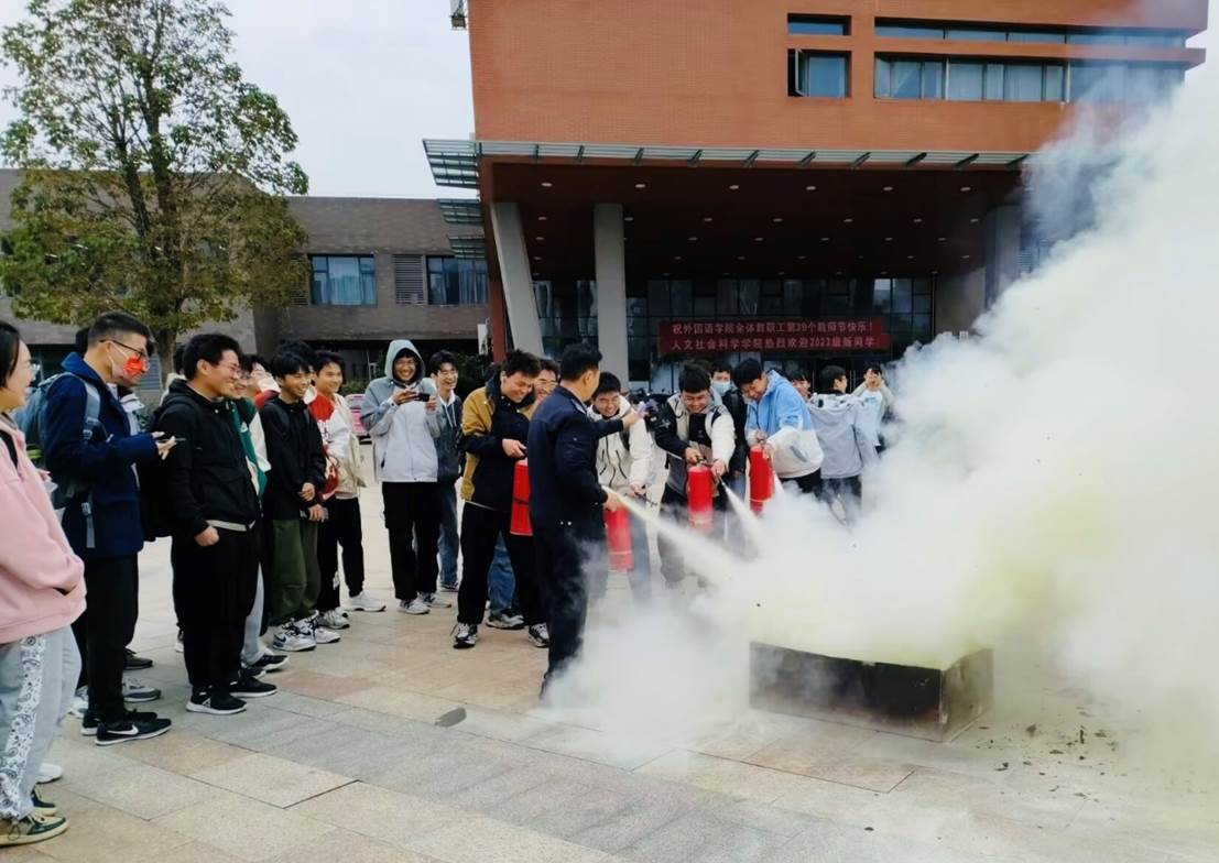 在崇智楼前广场,彭广峰老师为全体学生讲解了干粉灭火器使用的注意事项,向同学们演示灭火器的使用方法,并指导学生代表使用灭火器进行现场灭火演习。