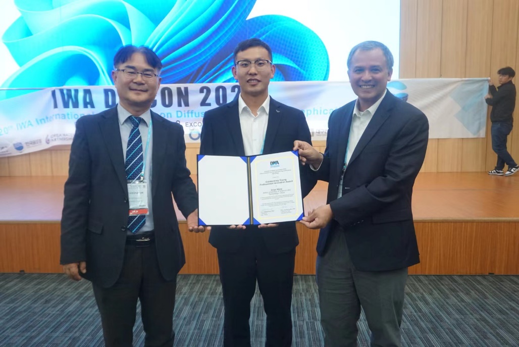 会议主席Eakalak Khan教授(右)和Lee-Hyung Kim教授(左)为王对雨颁奖(摄影:张丽娜、李昭静、会议组委会提供)