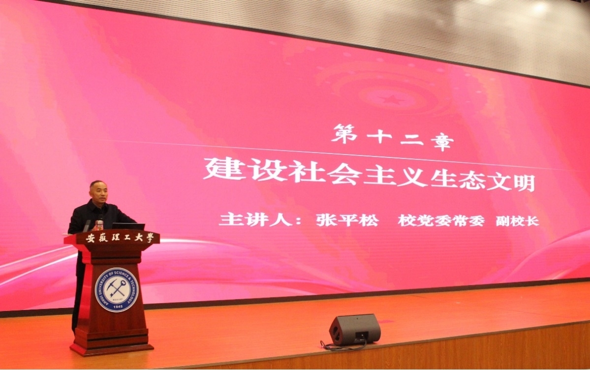 张平松以习近平生态文明思想为主线,从新时代为什么突出强调生态文明建设谈起,强调了生态文明建设在中华民族伟大复兴之路上的重要意义。他从发展方式、系统治理以及法规制度等多重角度解释了社会主义生态文明实践路径,用全球视角说明了全球生态文明建设之路,展示了人类命运共同体的伟大构想。张平松结合安徽省和淮南市经济社会特点,介绍了学校“四个融入”发展战略在生态文明建设中的现实实践。