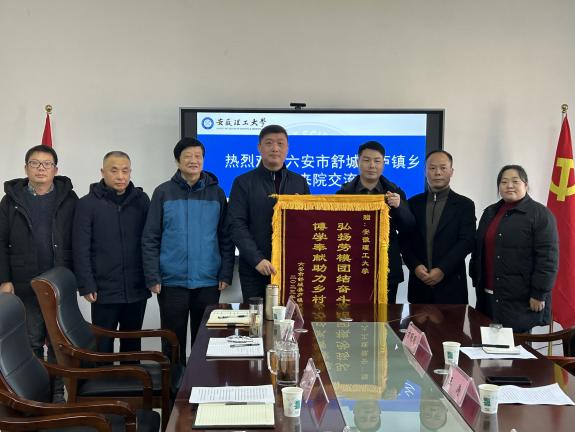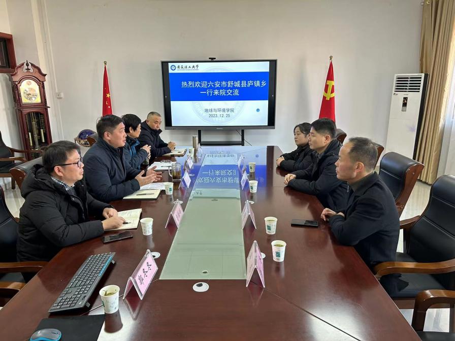 2023年12月25日,六安市舒城县庐镇乡党委书记王涛、乡长韦发长一行来到安徽理工大学地球与环境学院赠送题为“弘扬劳模团结奋斗精神 博学奉献助力乡村振兴”的锦旗,对学校为庐镇乡参评第三批全国地质文化村(镇)提供的支持表示感谢。学院党委书记陈楠、副院长吴荣新、鲁海峰和朱恒银教授等参加赠旗仪式与座谈会。