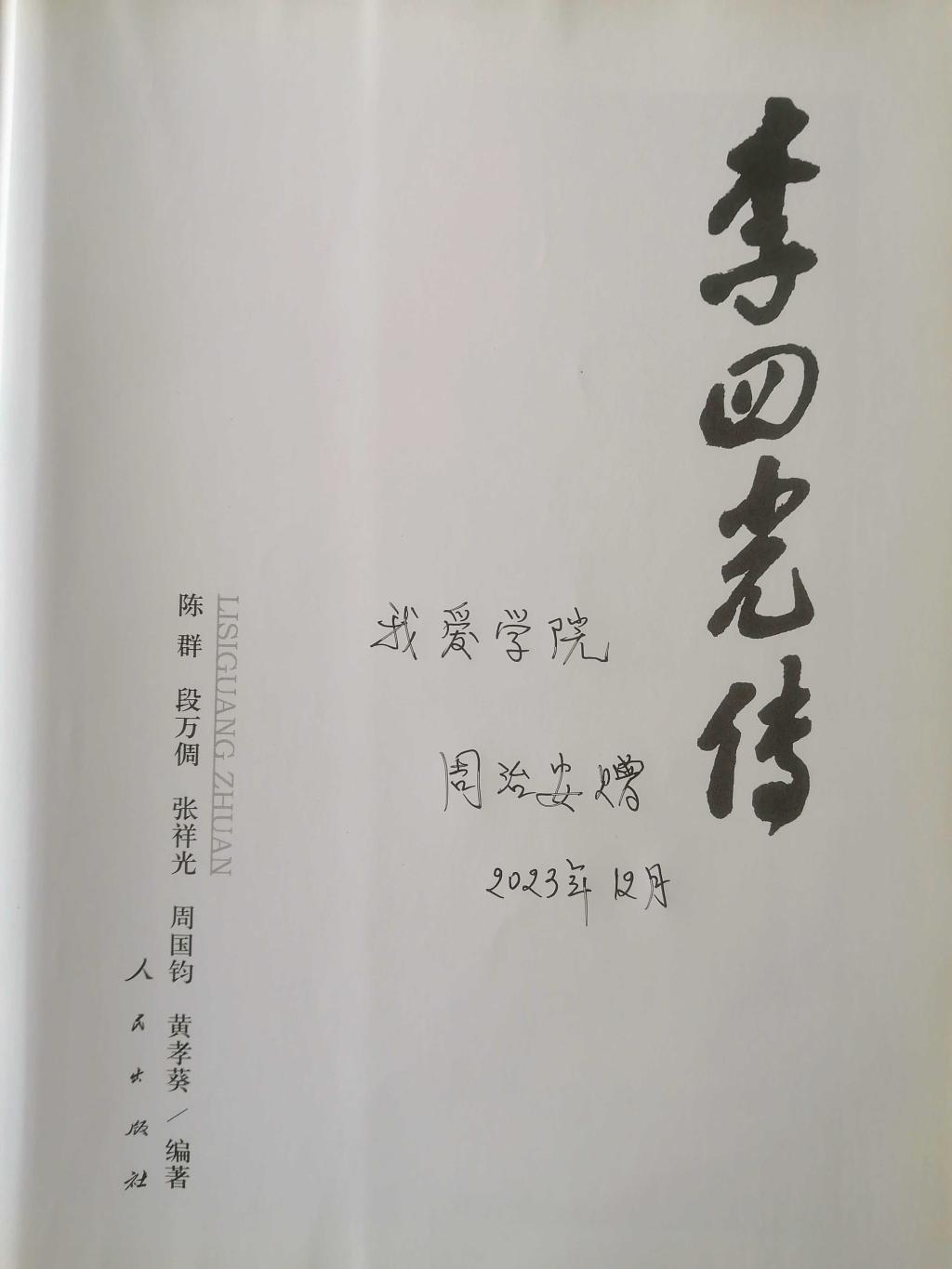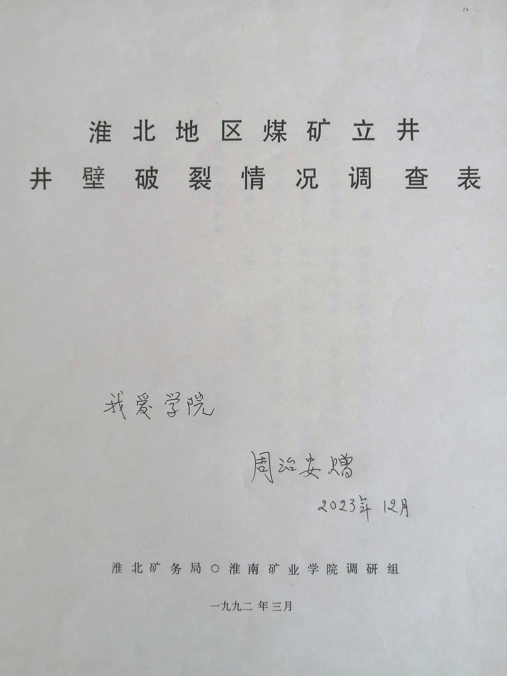 交流中,周治安教授回忆了二十世纪六十年代他被选调地质力学研究所,在李四光同志安排下,在西昌开展地震断裂带调查的点滴,介绍了二十世纪九十年代淮南矿业学院调研组在淮北地区开展煤矿立井井壁破裂情况调查的过程。赠书时,他郑重而又深情的在赠物上写下“我爱学院”。