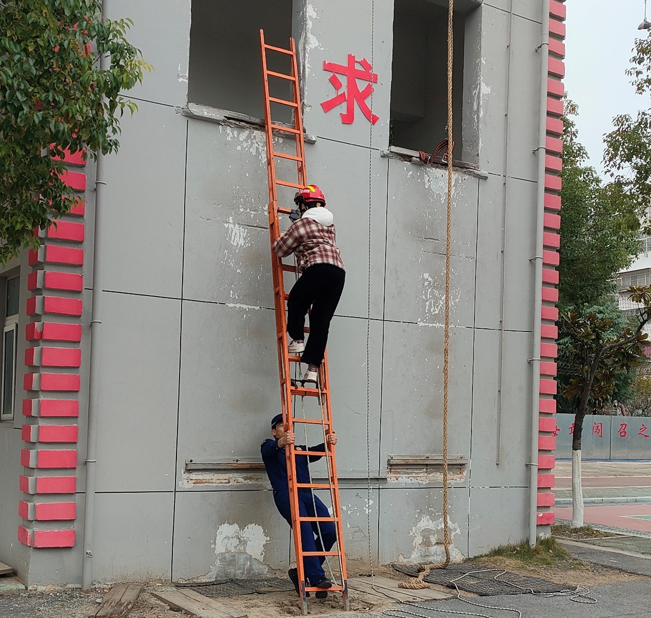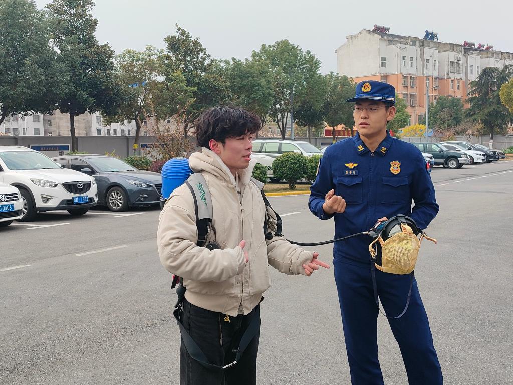 消防员们演示了绳索攀爬技能,仅用了十多秒时间,顺利达到四楼。学生们惊叹消防员的快速反应,敏捷身手和强大的团队合作。在消防员的专业保护下,学生们亲身体验了正压式空气呼吸机、穿戴消防服、绳索攀爬、低楼层自救等训练项目。矿物加工工程23-1班的朱启辉同学说:“背着不到40斤的正压式空气呼吸机往返跑了20米,感受到面红耳赤,呼吸局促,明显缺氧,非常难受。但是消防员们一旦进入救援现场,还要背着更加沉重的装备去进行救援,深刻感受到了消防员的艰辛,也认识到消防安全人人有责。”