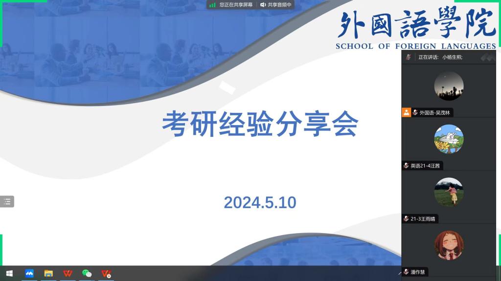 为厚植外院学子爱国荣校情怀,发挥优秀毕业生榜样引领和示范带动作用,积极营造热爱祖国、感恩母校、温馨和谐的毕业氛围,让爱国荣校情怀在广大外院学子心中牢牢扎根,5月6日至10日,外国语学院在“一站式”学生社区线上线下同步开展“我为学院做实事”公益服务活动。外国语学院2020级双优生和考研上岸优秀学子分别为2022级和2021级同学进行了经验分享。