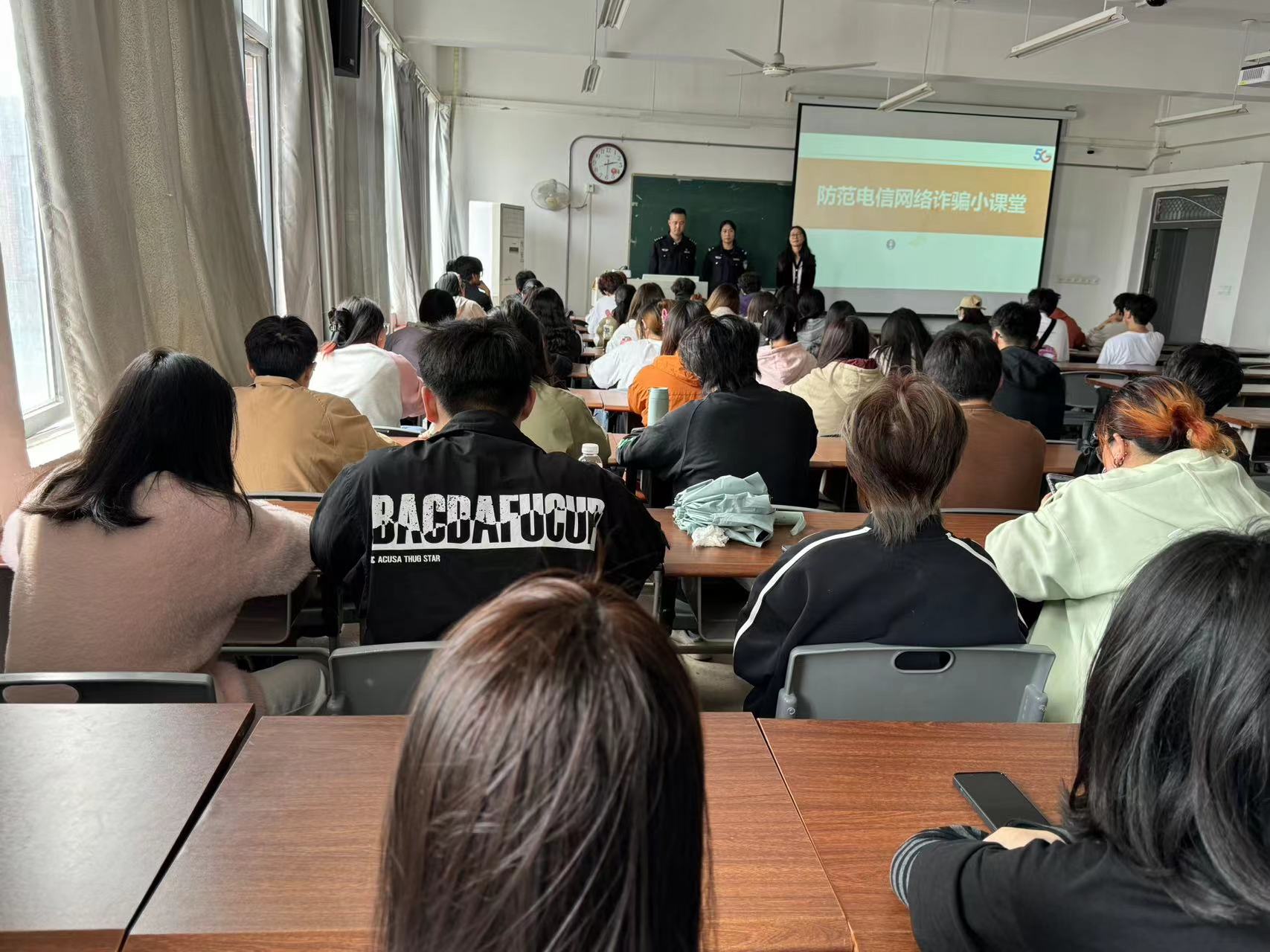 王远警官分别从五个方面为同学们进行讲述,一是什么是电信网络诈骗;二是犯罪分子骗局大揭秘;三是不能做骗子的帮凶;四是如何预防电信网络诈骗;五是遭遇电信网络诈骗怎么办?此外,王远警官也通报了近期发生在学校内的诈骗案例,通过真实案例来警示同学们:不要轻易相信天上会掉馅饼,做遵纪守法的大学生。