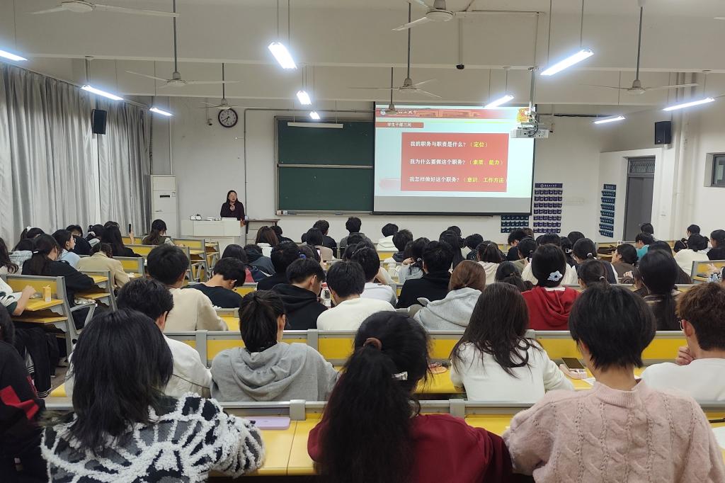 胡珊珊以《学生干部能力培养》为主题,向学生干部做了四个方面要求,一是要明确自己的角色定位,学生干部是学生,学生以学为主,要坚定自身理想信念,做好沟通师生的桥梁,努力传播正能量。二是要具备优秀的思想道德素质,本色做人,角色做事,努力提升的“文明行为习惯”、“道德品质”和综合业务素质;三是不断增强个人的服务意识、集体意识、开拓创新意识以及初心意识;四是要建立良好的人际关系,要率先垂范,勤奋工作,无私奉献,既要大胆工作,又要讲究方式方法。