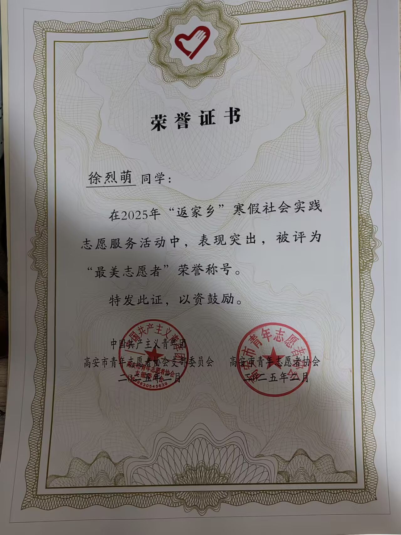 徐烈萌在江西省宜春市高安市多个志愿服务岗位开展实习实践。在“假日课堂”义务支教,她耐心地为孩子们辅导功课,用生动的讲解激发他们的学习兴趣;在高安市春运现场,她协助工作人员维持秩序,为旅客提供咨询引导,用真诚的微笑温暖他们的回家路;在高安市图书馆,她认真整理书籍,为读者营造舒适的阅读环境,用细致的服务传递知识的力量。短短一个寒假,她累计志愿服务时长超过50小时,被高安市团委授予“最美志愿者”等荣誉称号3项,用实际行动诠释了“奉献、友爱、互助、进步”的志愿精神,展现了新时代大学生的责任与担当。