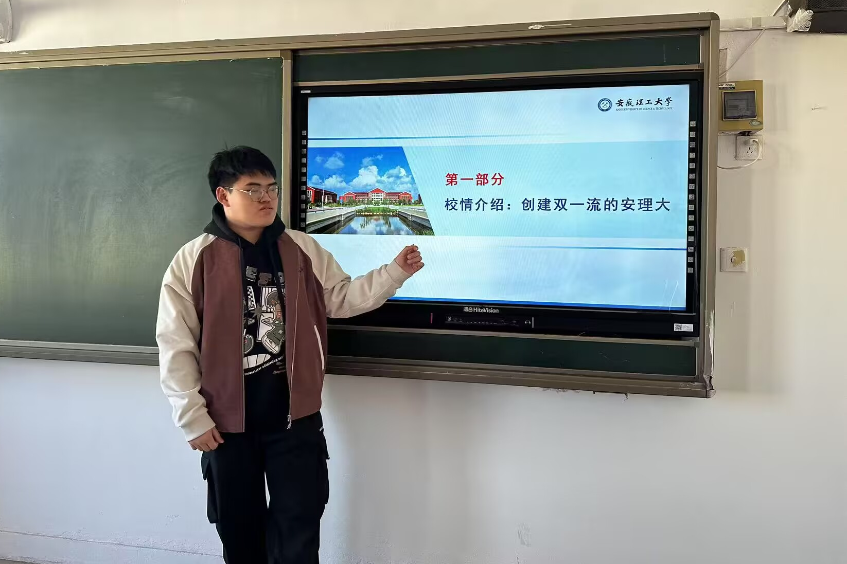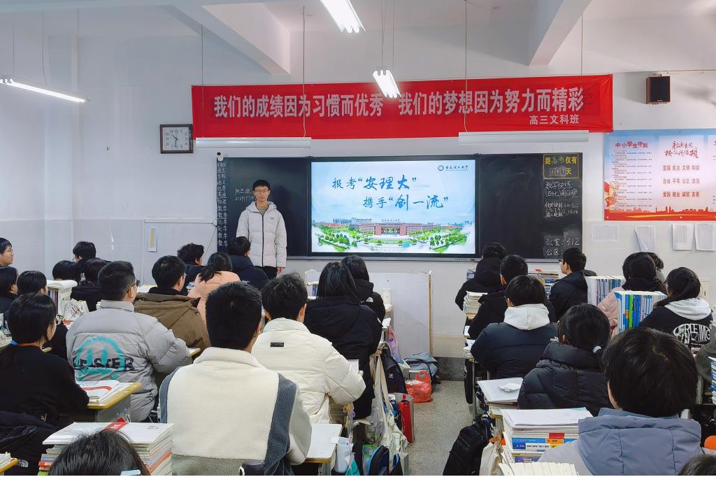 回访过程及感悟:再踏入高中校园,羊肠小道在脚下蔓延,往昔的记忆也在我脑海重演。心怀对母校的感恩与对大学的热爱,我将要向高三的学弟学妹们宣传我的大学分享我的大学生活。走进教室,不止好奇与期待,他们眼中更多的是对上大学的渴望。精心制作的宣传PPT、规范化的讲解,我向学弟学妹们逐一介绍了安徽理工大学悠久的办学历史、先进的教学设施、美丽校园的景色,这些无不吸引着他们好奇的目光。随后,与学弟学妹们分享自身的高考备考经验,讲述大学丰富多彩的学术活动、社团生活,让他们感受大学生活的魅力。在互动环节,面对诸如“如何选择适合的专业”“大学奖学金政策”等问题,耐心解答疑问。看到学弟学妹们眼中燃起的星星之火,我知道这次宣讲之旅已然有了意义,我为安理代言,发出了 “夜色难免微凉,前行必有曙光”的启示。