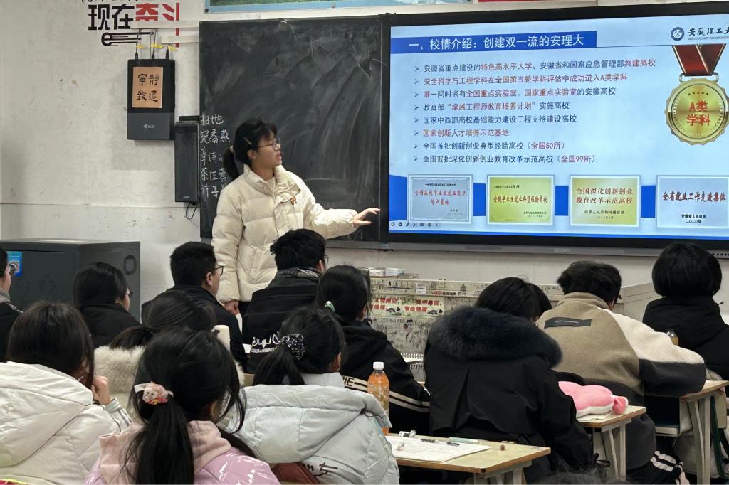 回访过程及感悟:回高中母校宣传安徽理工大学是一次充满意义的经历。走进熟悉的高中校园,看到学弟学妹们充满期待的眼神,我感到无比亲切。我详细介绍了安徽理工大学概况、历史文化、校园环境以及丰富的校园生活,并分享了自己在大学的学习与成长经历。通过互动交流,我感受到他们对大学生活的向往,也为自己能成为母校与安徽理工大学之间的桥梁而自豪。这次活动不仅让我重温了母校的温暖,也让我更加珍惜在安徽理工大学的求学时光。