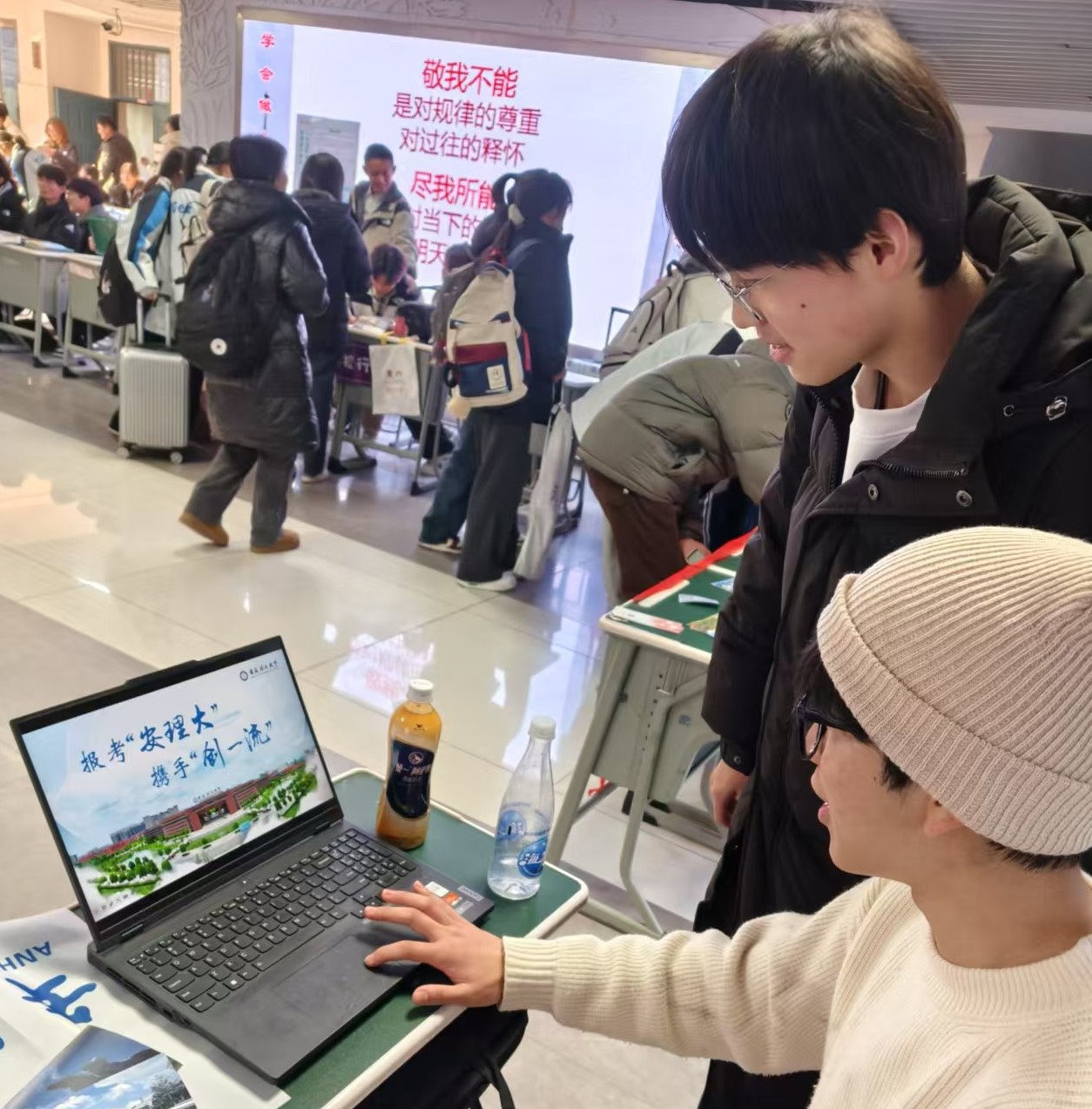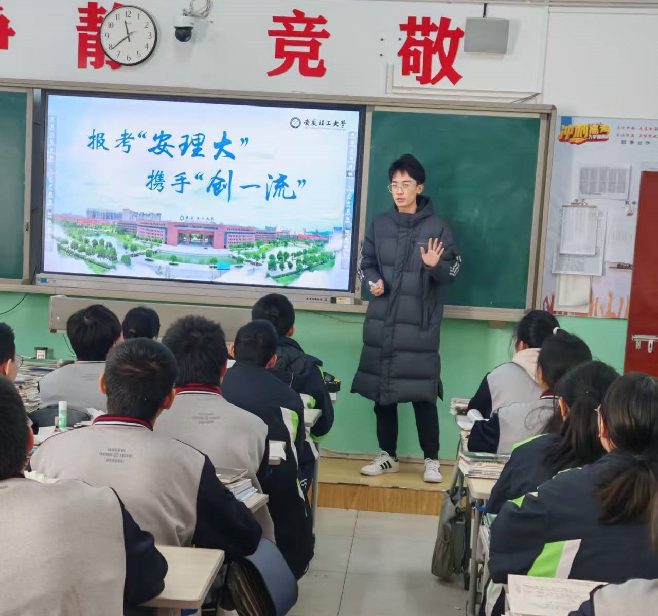 1月15日至2月10日,陈柯诺、张天浩、徐锦杰等11位同学作为安理“代言人”,用宣讲的方式,将“安理”带回家乡。11位宣讲人在各自高中母校结合安徽理工大学“双一流”创建的奋进历程,介绍了校史沿革、学科专业、录取规则、转专业、推免等相关方面的内容,并分享进入大学后的学习经验和生活感悟,传递安理温情,展现安理形象,为学弟学妹们的逐梦之路注入力量。