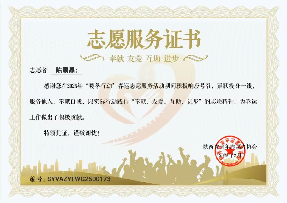 春节期间,学院组织化工24-3班陈晶晶、应化24-2班高梦瑶、能化23-1班秦智贤等多名志愿者,奔赴家乡火车站、高铁站、长途汽车站等重要交通枢纽,在当地交管人员的指导下,认真开展“青春志愿行,温暖回家路”的春运“暖冬行动”服务活动。在现场,同学们积极协助,维持秩序,克服了严寒天气坚守岗位,细致耐心,引导旅客、搬运行李、智慧购票,用热情周到的服务温暖每一位旅客回家的路。各地组织部门和志愿者协会给学院来发放表扬信或实践证书,表彰学生用实际行动诠释了“奉献、友爱、互助、进步”的志愿精神,展现出了新时代大学生的精神风貌。