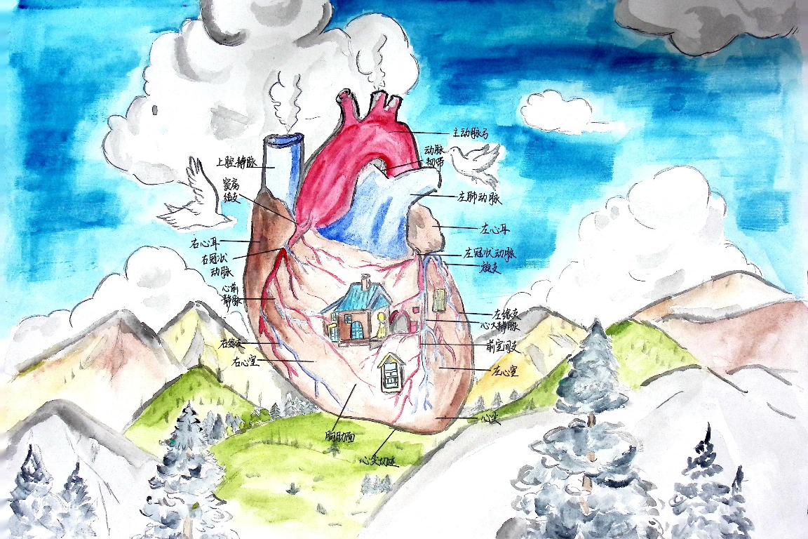临床24-4班陈奕苗的作品《心远地自偏》的立意源自陶渊明的诗句“心远地自偏”,以心脏的剖面图为主体,心脏被描绘成一座宁静的房子,象征着内心的居所表达了一种超脱世俗、心灵自由的状态。
