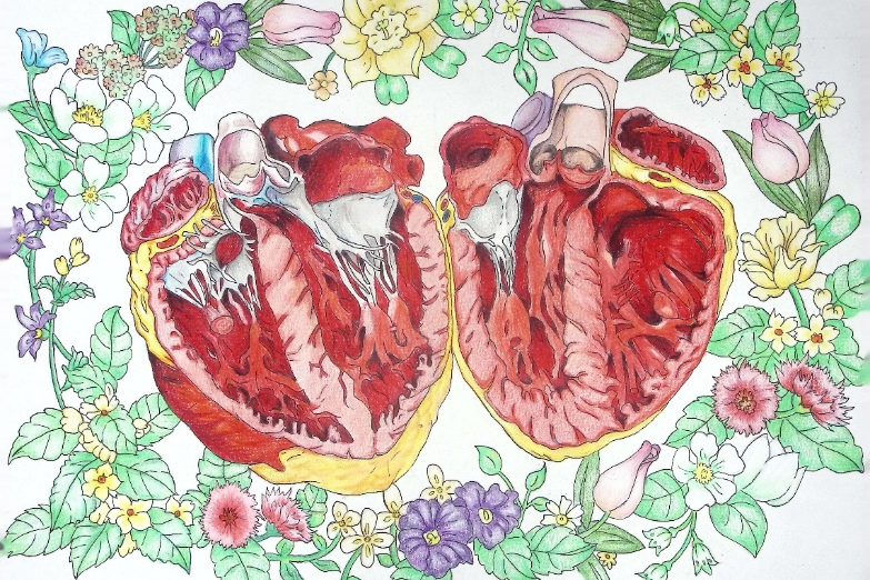临床24-4班丁妙妙的作品《繁华簇拥的生命引擎》以精细的笔触呈现了人体心脏的内部结构,心脏被绚烂多彩的繁花所环绕。心脏作为生命的动力源泉,象征着生命的蓬勃跳动;而繁花则寓意着生机与美好。