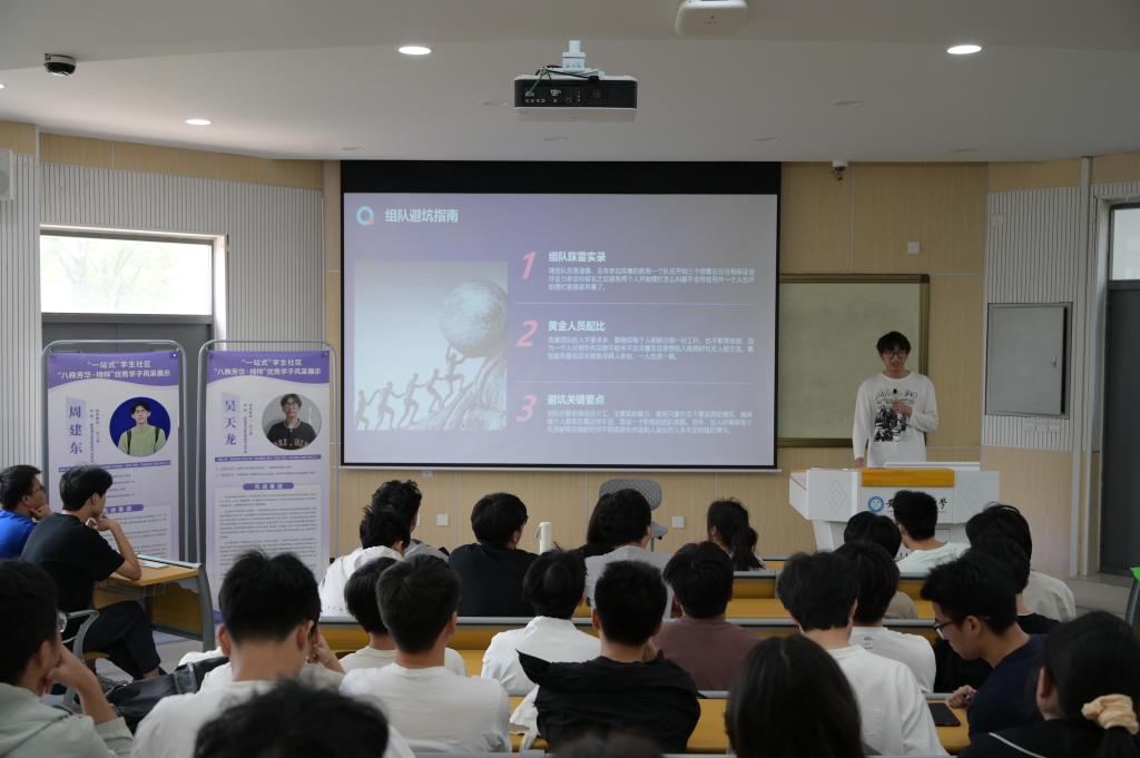 吴天龙和周建东均为2023级车辆工程3班的学生,他们既是同学,又是多场比赛的队友,二人携手,勇攀科创高峰,曾在中国机器人大赛暨RoboCup机器人世界杯中国赛智能车挑战赛中获全国二等奖、在全国大学生智能车竞赛中获安徽省基础组二等奖。活动第一环节为风采展示,吴天龙围绕认知突围、团队协作、资源整合法、项目实操四个方面展开了分享,重点讲述了参加全国大学生智能车竞赛过程中克服困难的事例,也为大家提供了高效资源获取的若干个途径。周建东传授了个人课外学习的内容比如用处较大的学习网站,分享了与队友曾在暑假期间共守校园、深耕技术的科创竞赛参与经历,为2024级学生勾勒了一幅入门智能车比赛的蓝图。活动第二环节为现场答疑,由学院2024级辅导员秦致远主持,现场氛围热烈。