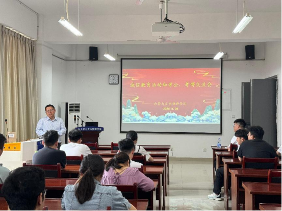 5月28日下午,力物学院在明道楼A321报告厅举行了研究生诚信教育和考公、考博经验交流会。学院光电物理系主任李洋、辅导员及全体研究生参加了会议。