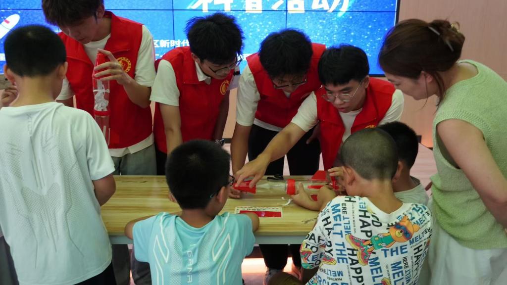 上午,志愿者们开启社区科学之门,科普讲座从火箭起源讲起,深入浅出地介绍中国航天发展历程。通过故事和视频,让孩子们感受航天事业的伟大与先辈们的执着追求。在水火箭制作环节,志愿者讲解原理并指导孩子们动手组装。孩子们在交流中完成制作,现场欢声笑语不断。他们不仅掌握了水火箭构造,还锻炼了动手能力和团队协作精神。