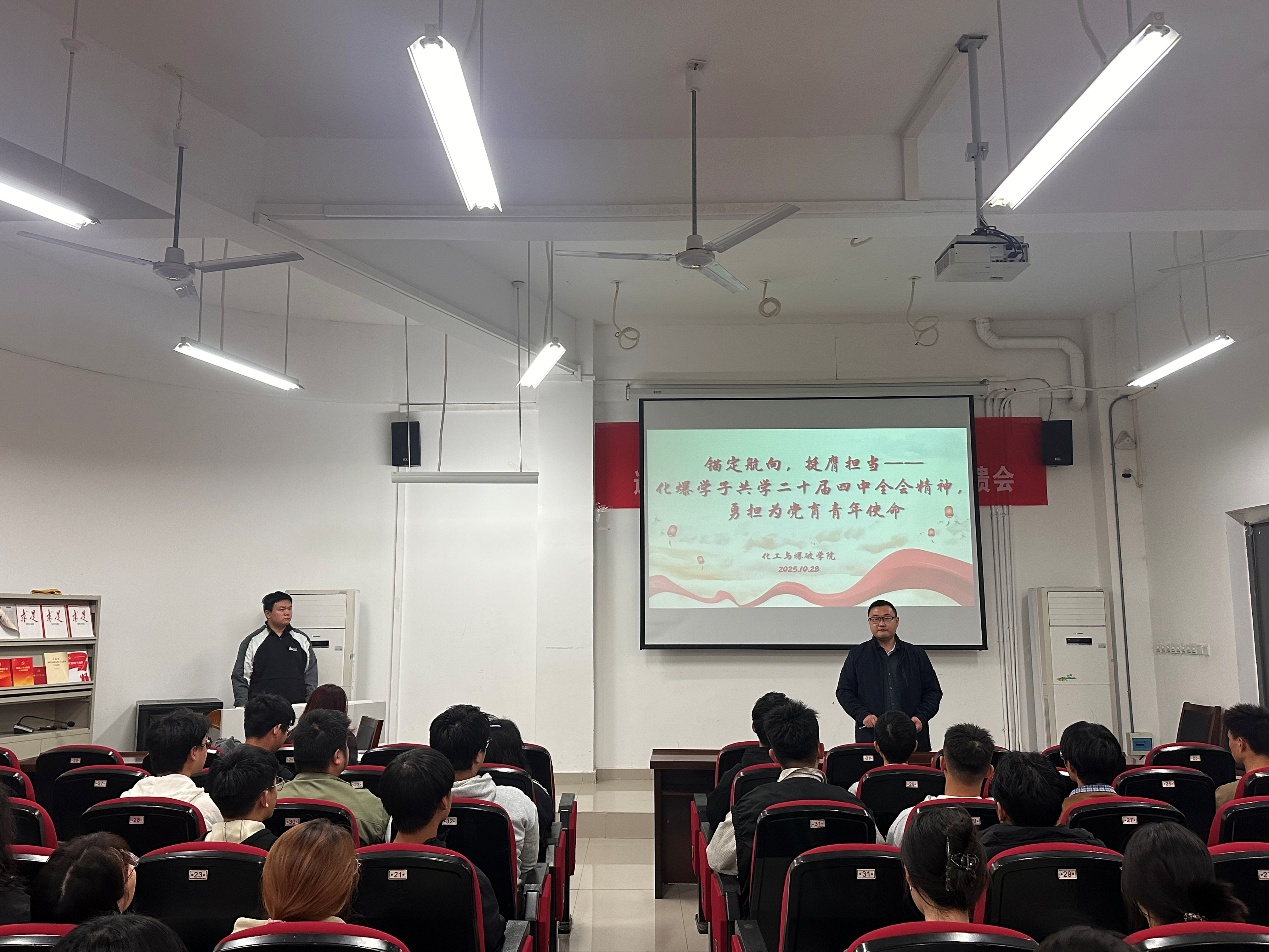 为深入学习贯彻党的二十届四中全会精神,10月28日,化工与爆破学院团委在崇礼楼东102组织专题学习会议,学院团委负责人和青年学生骨干参加学习交流。