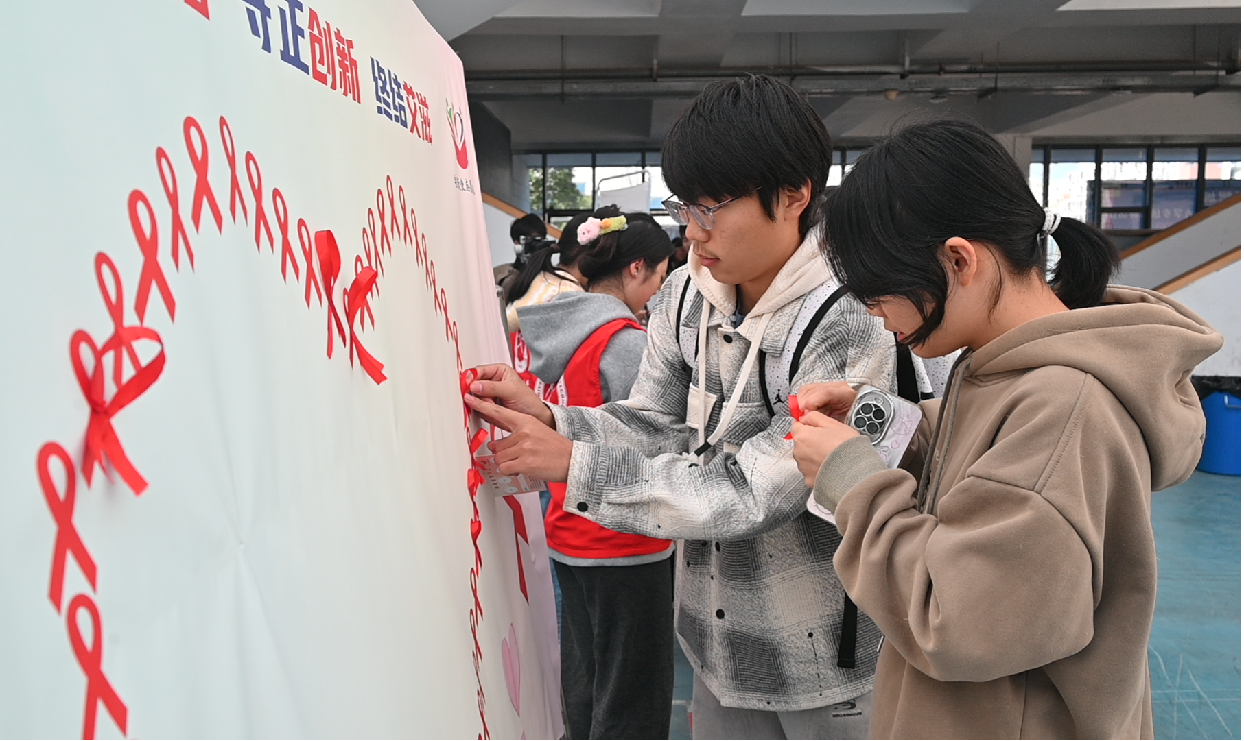 学生粘贴红丝带