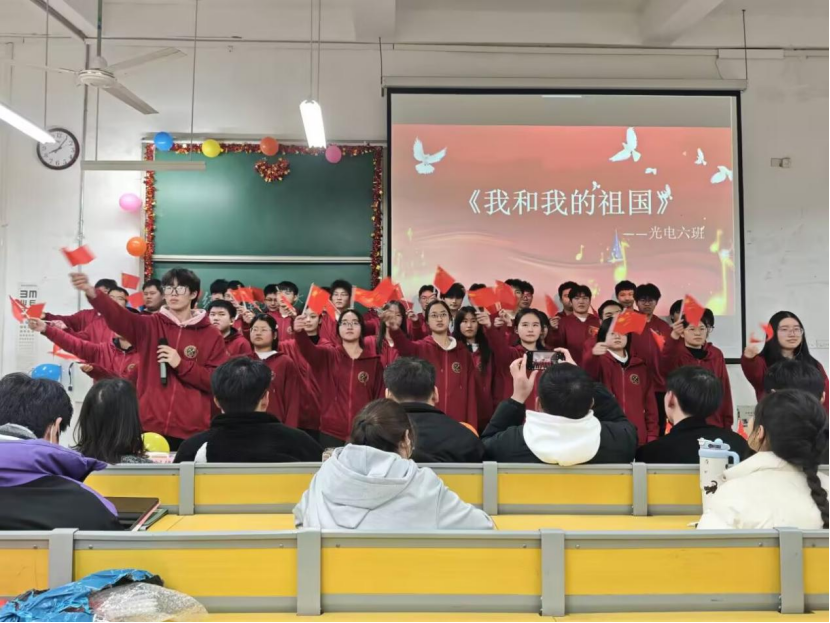 现场气氛热烈,掌声此起彼伏。各班级代表队依次登台,深情演绎了《我和我的祖国》《紫荆花盛开》《如愿》等多首经典爱国歌曲。同学们精神饱满、歌声嘹亮,以饱满的热情展现了力光电学子昂扬向上的精神风貌和深厚的家国情怀。