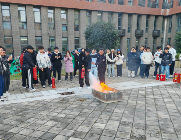 理论培训结束后,全体师生移步室外,进行了一张紧张有序的灭火实操演练。在彭广峰的现场指导下,师生们轮流操作使用灭火器,亲身实践了“提、拔、握、压”的灭火步骤,对模拟火源进行了有效扑灭,熟练掌握了实战技能。