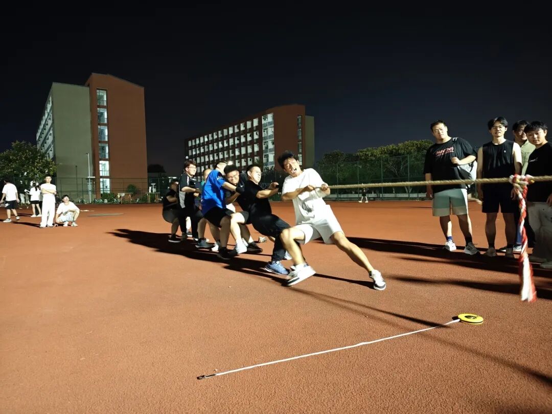 拔河赛场上的呐喊此起彼伏,双方队员在绳索两端展开力量与意志的较量。赛场的另一侧毽子在女生脚尖轻盈起落,划出一道道灵动的弧线。“摸石过河”的选手们沉着稳健,在“石块”上稳步前行。集体跳绳区域充满节奏感,队员们依次穿过翻飞的长绳,展现出高度的默契与配合。这些趣味比赛项目充分展现了同学们积极向上的精神风貌与出色的团队凝聚力。