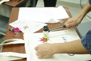 讲解完毕,同学们将新鲜的植物叶片和花瓣铺放在白色的布袋上,用小锤子轻轻敲打,使植物的汁液渗透进布料,一时间“哒哒哒”声此起彼伏。同学们以锤作画,借素娟之布,载植物之身,全神贯注沉浸在创作的喜悦中,在拓染的过程中释放了压力,舒缓了情绪。