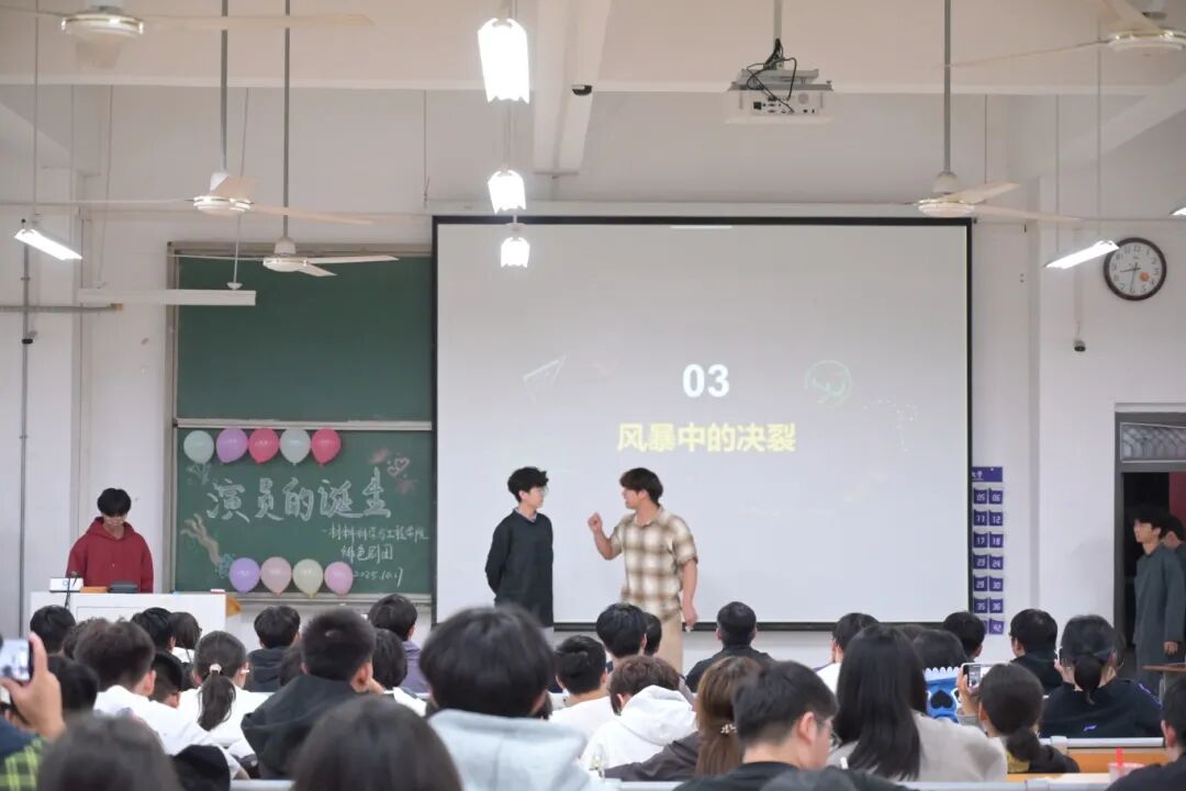 华灯初上,艺韵悠扬。2025年10月17日晚,材料科学与工程学院绯色剧团在明理楼102教室成功举办“演员的诞生”主题戏剧汇演。本次汇演汇聚十余部精心打磨的戏剧作品,现场座无虚席,掌声与喝彩声此起彼伏,热烈氛围贯穿始终。