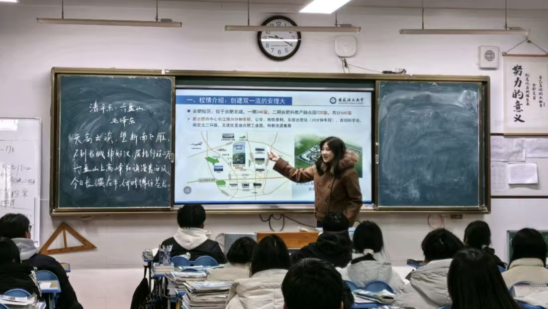 3.实践内容:重返合肥市第十中学,以“我为安理代言”为题,赴一场青春接力的实践之约。我通过PPT和视频,向学弟学妹们讲述了安徽理工大学建校80年的辉煌成就,分享了办学特色,展示了安全工程等专业的学科优势,进行了面对面的交流与答疑,帮助他们更清晰地规划未来。
