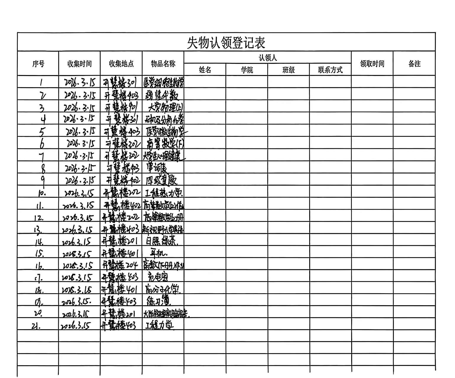 活动中,志愿者们对开慧楼各教室进行全面巡查与细致清理,认真捡拾、规范整理桌面、抽屉及角落散落的书籍、文具、耳机等遗失物品。大家将物品统一登记贴标后,移交至耕心楼“一站式”综合服务中心失物招领处,方便失主及时认领。