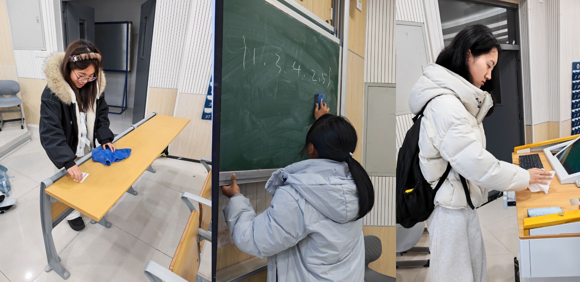 3月18日,学院各班级团支部组织志愿者聚焦学校耕心楼,开展“精细化”清洁志愿服务活动。志愿者们分组清理粉笔灰,擦拭黑板槽、讲台、多媒体设备控制台等易积尘区域,让教学环境焕然一新。
