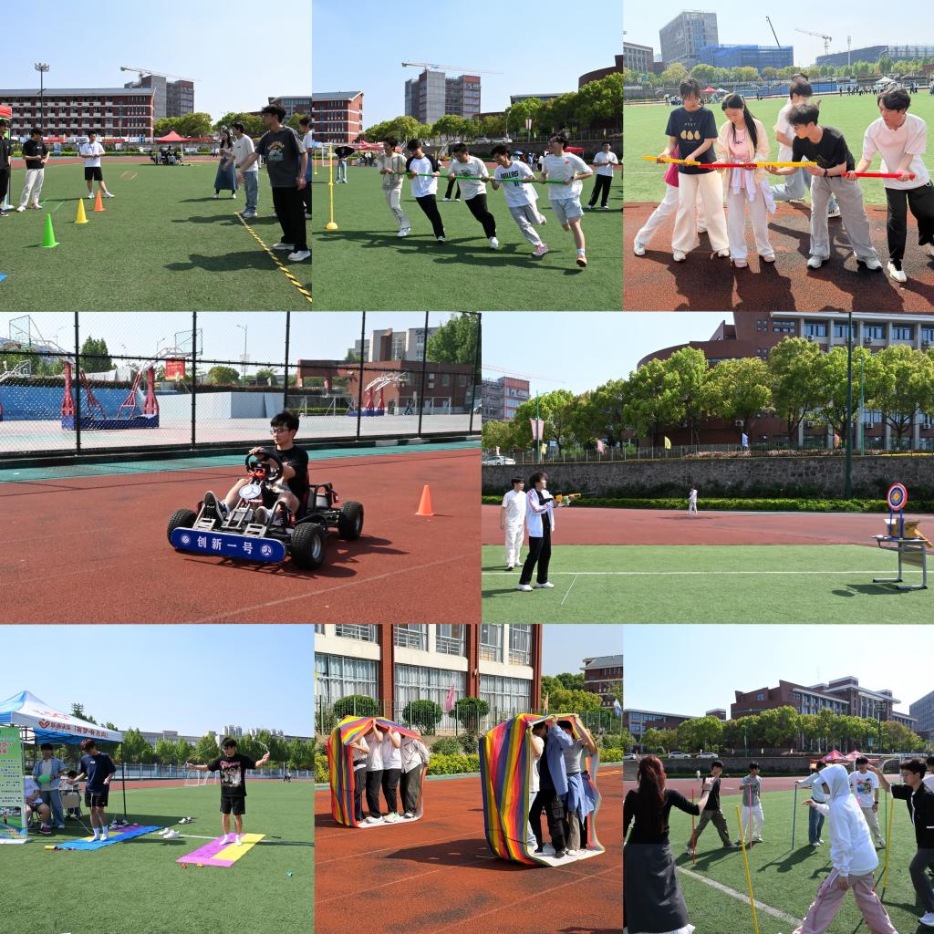 下午14时,各学院代表队签到集结。简短开幕仪式后,积分制竞赛正式开启。各代表队自由选择项目顺序依次挑战,裁判分项记录成绩,赛后统一核算总积分。不倒森林考验专注与抗干扰能力;高山流水要求团队配合传递小球;无敌风火轮与旋风跑展现默契步伐;心灵奇旅融合指压板跳绳、气球爆破与情绪猜词,让同学们尽情释放压力。自由体验区的卡丁车绕桩和射击项目人气高涨,达标学生获赠纪念品。