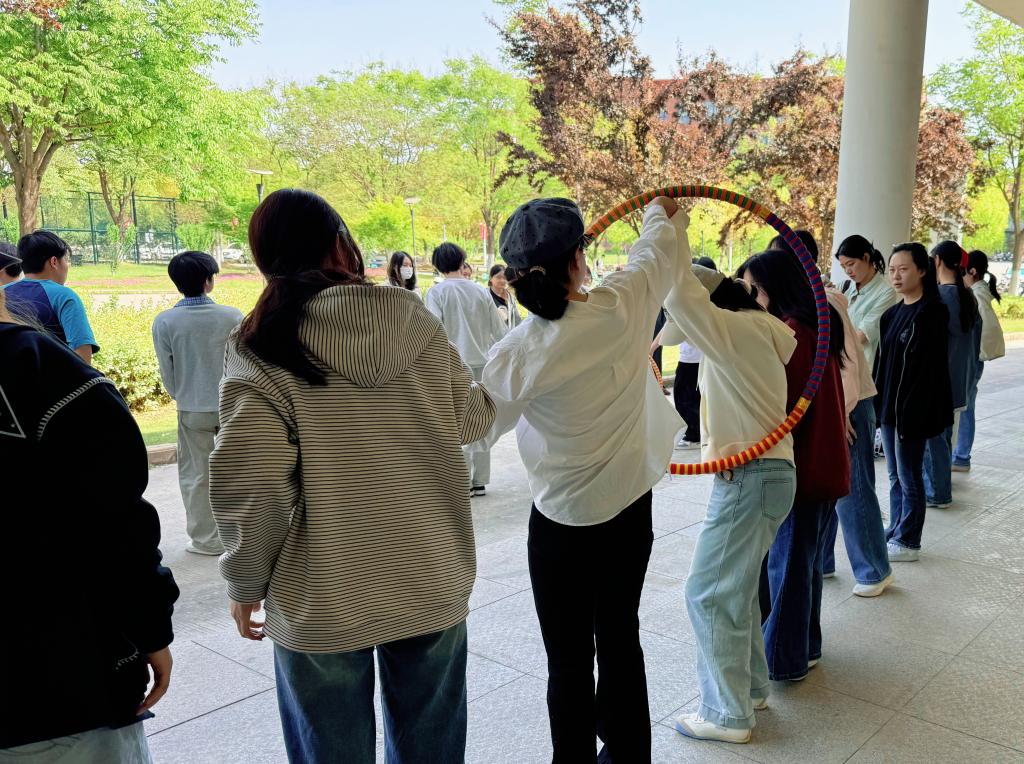 素质拓展环节则充满了欢声笑语与青春活力,活动设置3人捆腿跑、呼啦圈传递等趣味竞技项目,以团队协作形式开展,充分考验同学们的默契配合与协调能力。3人捆腿跑项目中,大家喊着整齐的口号,步伐一致、协同向前;呼啦圈传递项目中,同学们配合默契,在接力竞速中展现昂扬向上的青春风采。