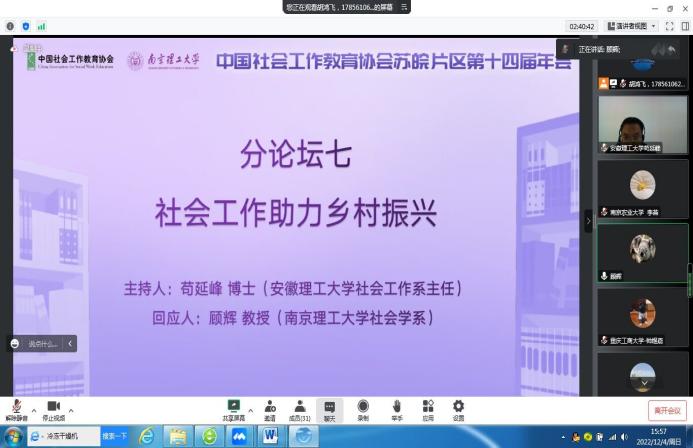 12月4日,由中国社会工作教育协会苏皖片区社会工作中心举办、南京理工大学公共事务学院承办的“中国社会工作教育协会苏皖片区第十四届年会暨共同富裕——社会工作站建设与基层治理论坛”在线举行,我校人文学院师生积极参会。社工系主任苟延峰主持“社会工作助力乡村振兴”分论坛并作主题发言。